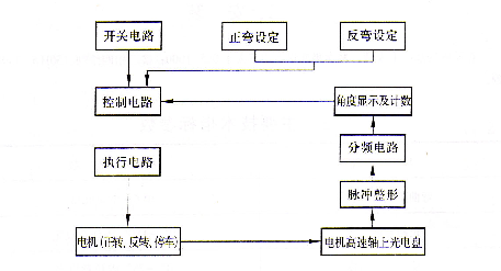 本試驗(yàn)機(jī)的工作原理:采用數(shù)字集成電路,試驗(yàn)機(jī)的彎曲角度由電機(jī)高速軸上取得的光電脈沖整形分頻后,進(jìn)行角度計(jì)數(shù)并不斷累計(jì)顯示,當(dāng)試驗(yàn)機(jī)工作盤轉(zhuǎn)至所設(shè)定的角度時(shí),經(jīng)邏輯電路控制,使制動(dòng)電機(jī)斷電停止轉(zhuǎn)動(dòng)。為了保證操作人員和設(shè)備的安全,該設(shè)備還配有可靠的限位機(jī)構(gòu),當(dāng)電氣控制部分發(fā)生失控或誤操作時(shí)可及時(shí)使設(shè)備停止運(yùn)轉(zhuǎn)。