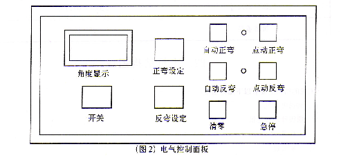 2、電氣控制面板設(shè)置:電氣控制面板上(如附圖2)設(shè)置有點(diǎn)動(dòng)正彎、點(diǎn)動(dòng)反彎、自動(dòng)正彎、自動(dòng)反彎按鈕,還設(shè)置有急停按鈕、清零按鈕,并有彎曲角度顯示裝置,自動(dòng)正、反彎曲指示燈,自動(dòng)正、反彎曲角度的設(shè)定裝置及總開(kāi)關(guān)。